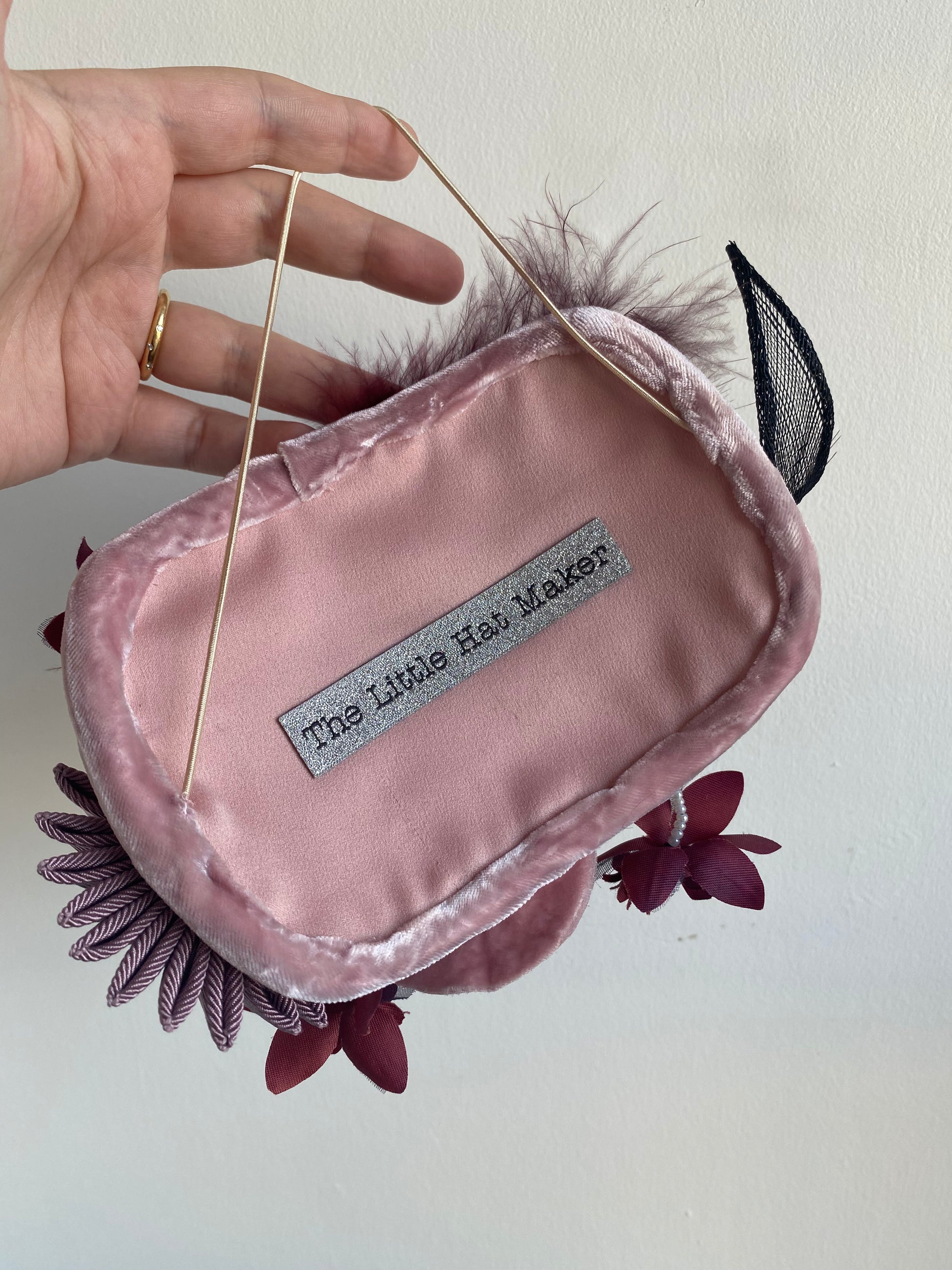 The base is covered with pale pink* silk velvet and a handmade rose is made in the same fabric.